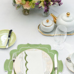 Для сервировки завтрака были предложены зеленые плейсматы, гармонирующие с хлебными тарелками цвета «матча». Елена рекомендует смело играть с цветом стекла: стаканы для воды из цветного стекла идеально подойдут для реализации этой идеи. Цвета текстиля могут обыгрывать оттенки букета цветов, что станет эффектным дополнением визуальной эстетики.