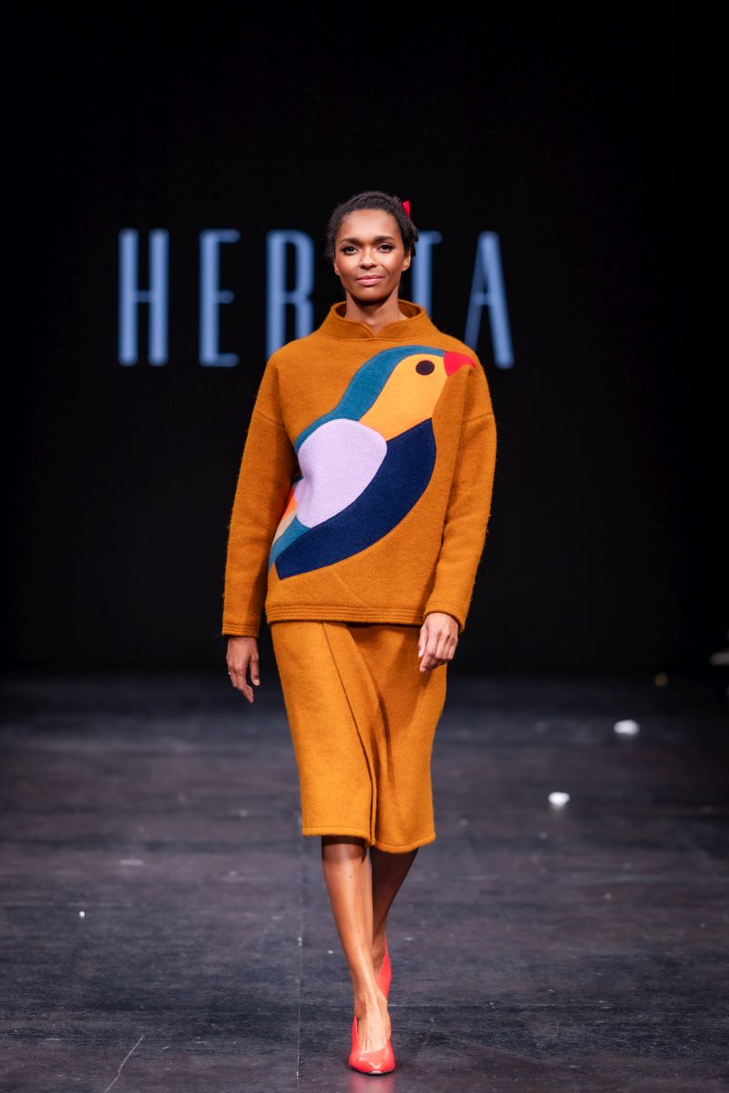 Бренд Hertta, родом с Сааремаа, показал яркую осенне-зимнюю коллекцию, полную красок и тепла. Основная идея — переосмыслить традиционную шерсть как материал для современных, прочных и функциональных вещей, идеально подходящих к изменчивому северному климату.