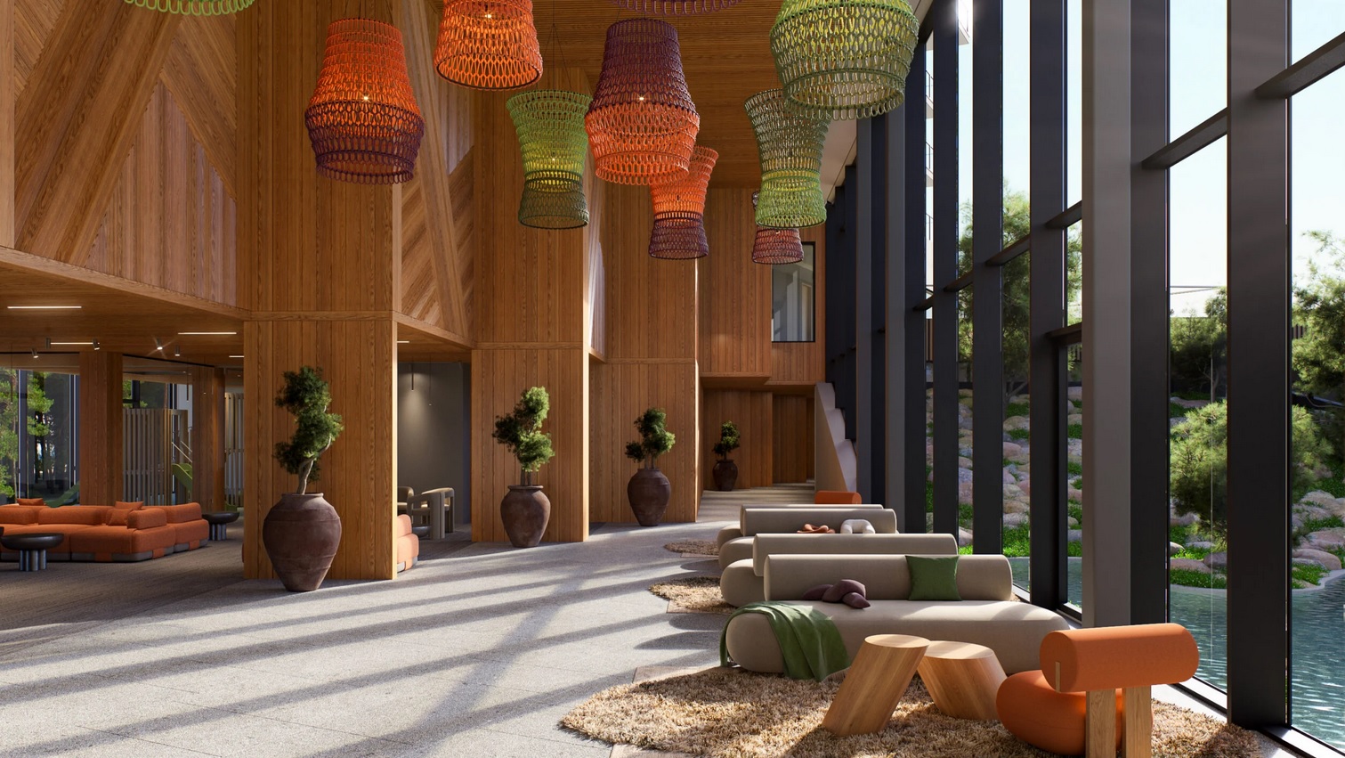 Почти готов и деревянный фасад здания — строительные леса постепенно снимаются. Поздней осенью и зимой внимание сосредоточено на работах по внутренней отделке. Набор персонала начнётся в начале нового года — открывающийся спа предложит около ста рабочих мест.