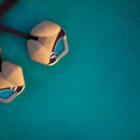 Здесь всё напоминает декорации научной фантастики: плавные обтекаемые формы, круглые платформы над водой, приватные бассейны, «парящие» над лагуной, и дорожки, соединяющие купольные павильоны, словно элементы космической базы.