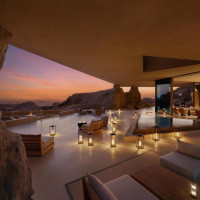 Номера напоминают пещеры с панорамными окнами: просыпаешься — и перед тобой марсианский пейзаж без единого намёка на цивилизацию. Главный бассейн зависает над пропастью, а по вечерам горы подсвечены так, что пейзаж становится сюрреалистичным.
