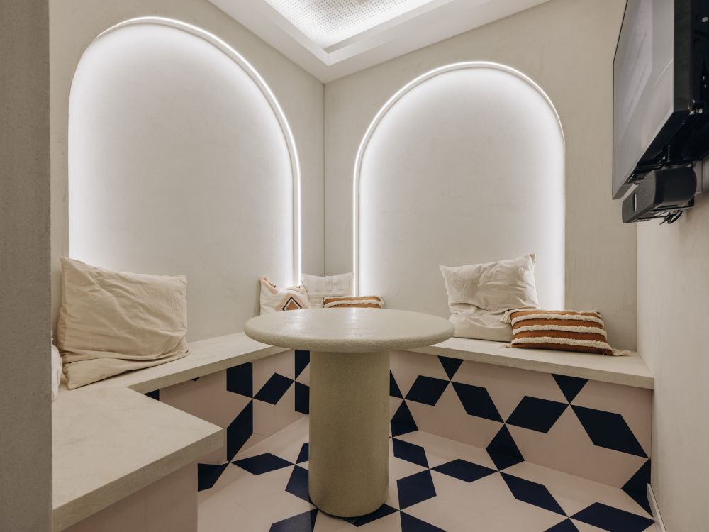 Так появились два пространства: Carpe Diem и Carnaval!. Первое –камерное, тихое место, где можно спокойно поговорить или собраться с мыслями. Второе – смелое, открытое пространство, наполненное тропической энергией мексиканских сенотов – природных подземных водоёмов. «Комната Carpe Diem маленькая, без окон. Я вспомнила, как во время моей первой практики для встреч с наставником была свободна только сауна. Так возникла идея создать для Wise что-то вроде хаммама, где можно вести “банные” разговоры – в тёплой, спокойной и безопасной среде», – говорит Ханна.