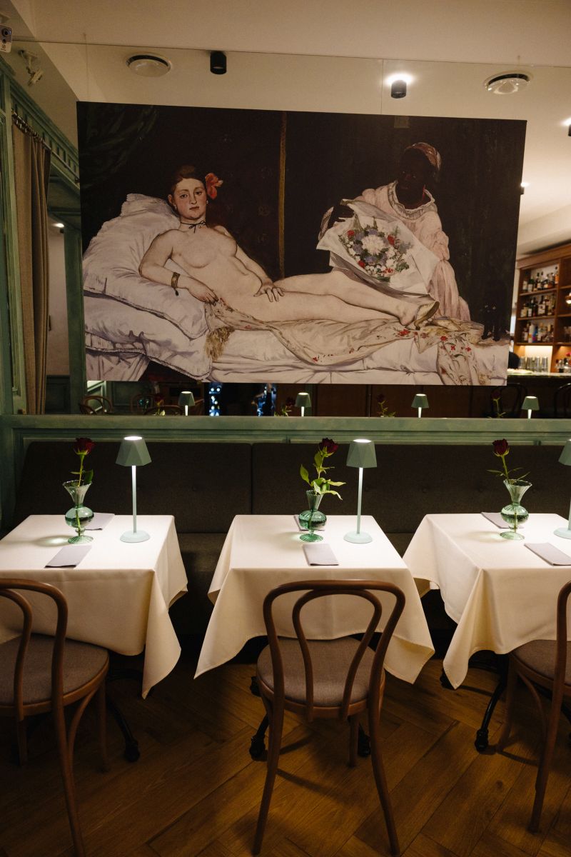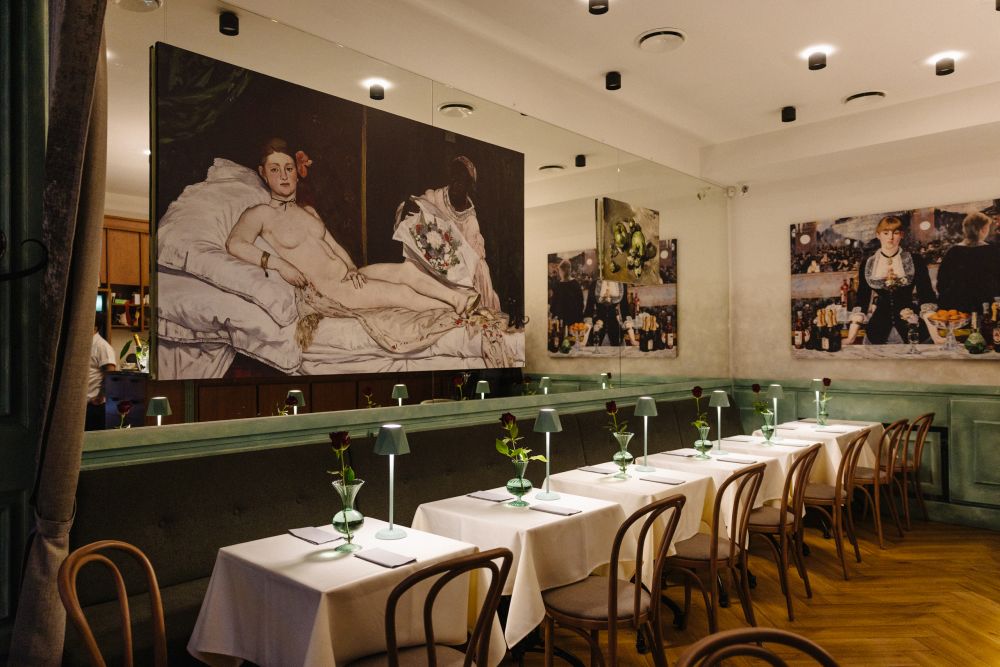Интерьер MaMà Bistro вдохновлен буржуазным очарованием классического французского бистро с легкими ностальгическими отсылками. Стены оформлены репродукциями картин известных французских импрессионистов. Проект воплотил дуэт дизайнеров — Алвис и ИнгунаЗемзари.