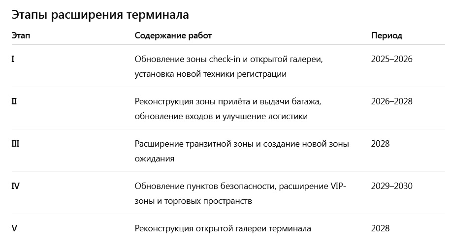 «Завершение пятого этапа— это момент, когда будет полностью обновлена открытая галерея и зона прилёта», — отметил Тувике.
