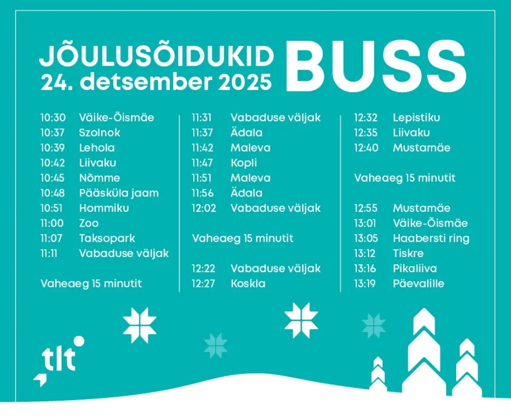 При этом, как отметил Падар, за праздничной атмосферой стоит большая ежедневная работа. Во время рождественских дней около тысячи сотрудников TLT продолжают трудиться круглосуточно, чтобы городской транспорт функционировал бесперебойно. Водители, диспетчеры, работники по уборке и обслуживанию транспорта и многие другие специалисты вносят свой вклад в то, чтобы передвижение по Таллинну оставалось безопасным и комфортным даже в праздничный период.
