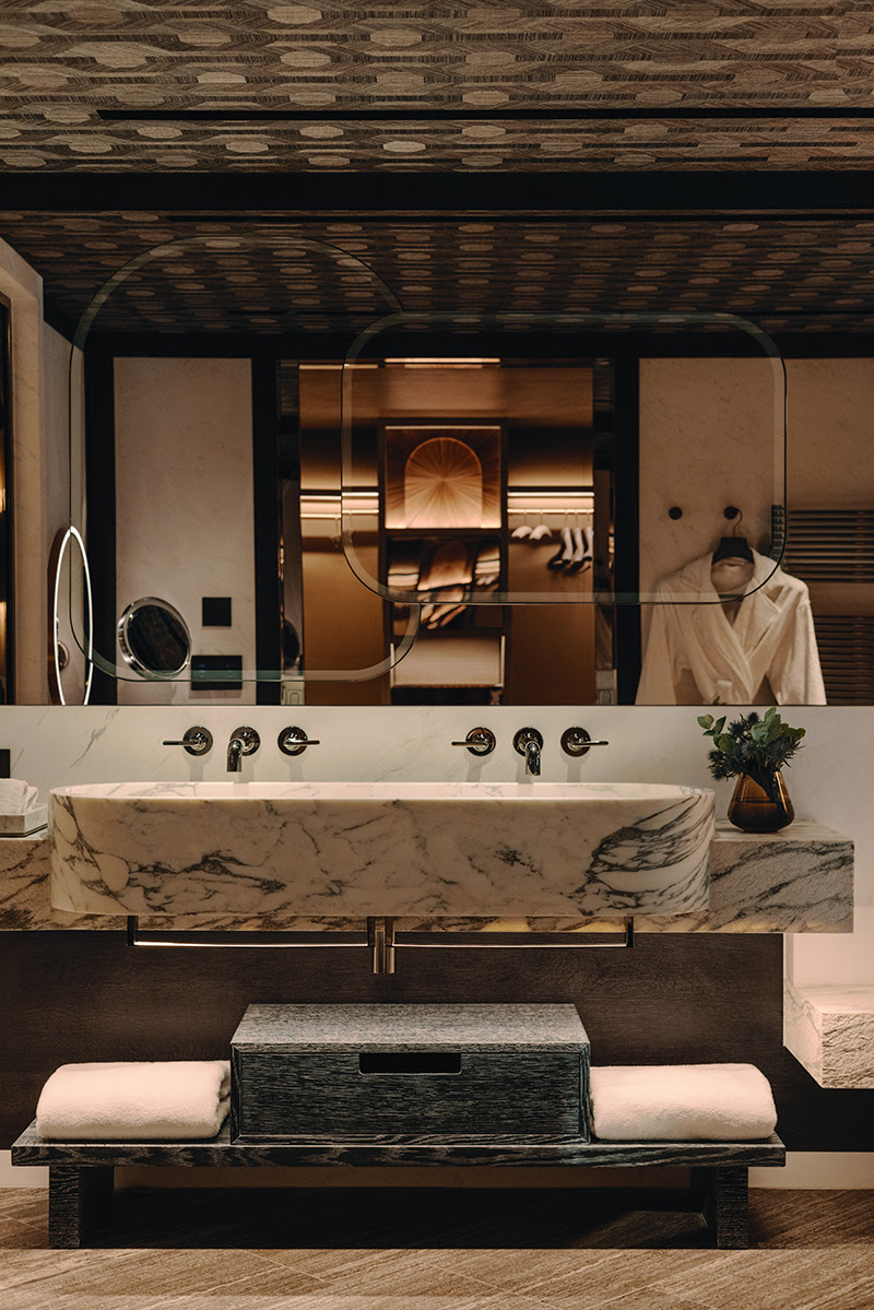 Известный французский дизайнер Тристан Ауэр воплотил здесь свое видение современной альпийской роскоши, отдавая дань очарованию золотого века Куршевеля 1960-х годов. Курорт спроектирован таким образом, чтобы органично вписаться в природное величие французских Альп. Тристан Ауэр филигранно сочетает дерево и камень с металлом и зеркальными поверхностями. Теплые тона, обтекаемые формы, камин, мягкое освещение и тактильно приятные ткани создают пространство, где хочется проводить все свободное время, любуясь заснеженными вершинами французских Альп.