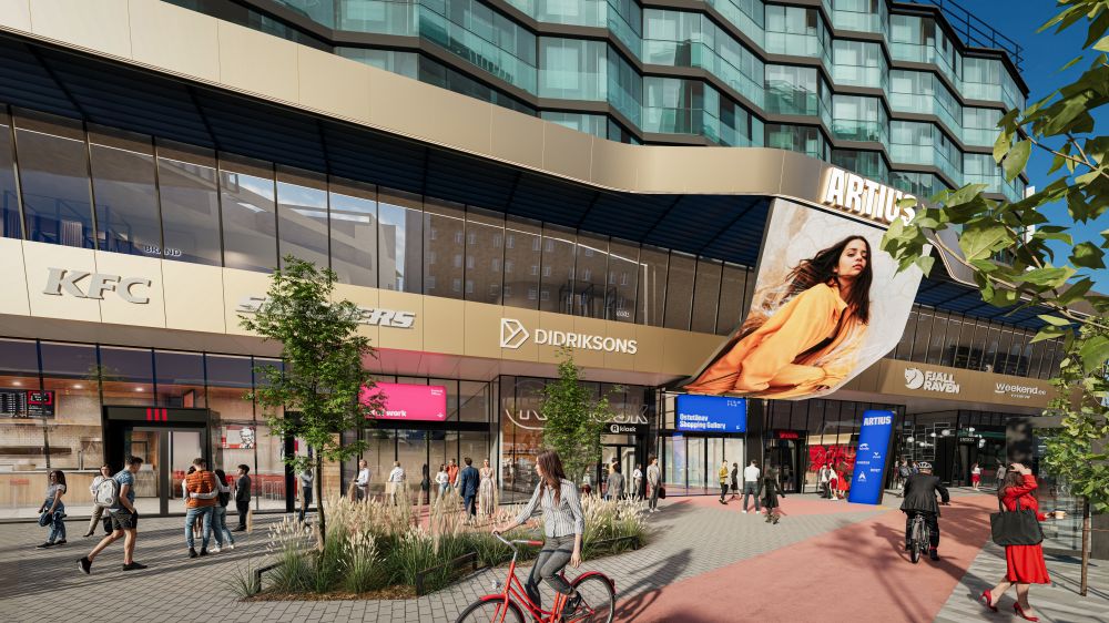 Помимо торговой улицы, в начале лета в Artius откроется «оазис в центре» — зелёная зона, интегрирующая природу в городскую среду. Для посетителей предусмотрена подземная парковка на 128 мест.