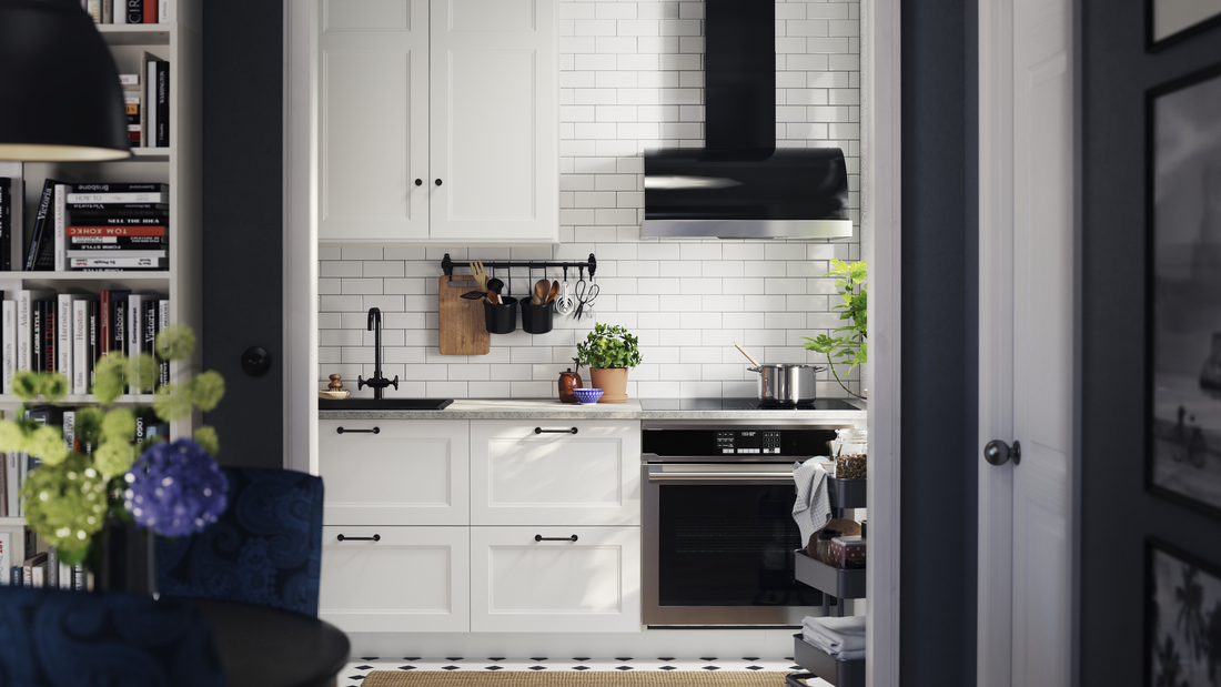 Еще один полезный совет от Миквере – использовать кухонный фартук как дополнительное пространство, чтобы вешать на него полочки для специй и устанавливать крючки для самой ходовой кухонной утвари. Так столешница остается свободной, а нужные вещи всегда под рукой.