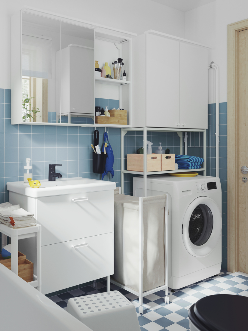 По словам дизайнера интерьера, типичная ванная комната – около пяти квадратных метров, но часто в ней одновременно размещаются и ванна, и стиральная машина. Чтобы использовать ее по максимуму, нужно подойти к делу с умом. Например, полка, установленная над стиральной машиной или унитазом, поможет создать дополнительное место для хранения моющих средств, банных полотенец или даже маленьких коробок с мелочами. А узкая корзина для белья отлично впишется в узкий промежуток между стеклом душа и тумбой под раковиной.