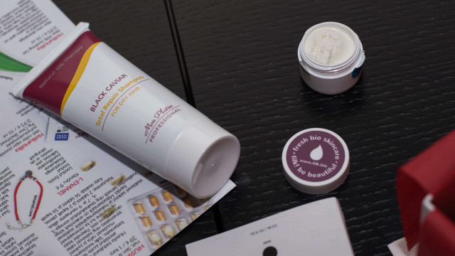 В ILLI BOX мы получаем 14 таблеток и 14 капсул пищевых добавок, которые помогают улучшить состояние волос, кожи и ногтей. Таблетки содержат витамины и минеральные вещества, а капсулы — масло макадамии и Омега-3. В оригинале в упаковку входит 56 таблеток и столько же капсул, которые необходимо принимать дважды в день. По понятным причинам, эффективность этого продукта мы никак проверить не смогли.